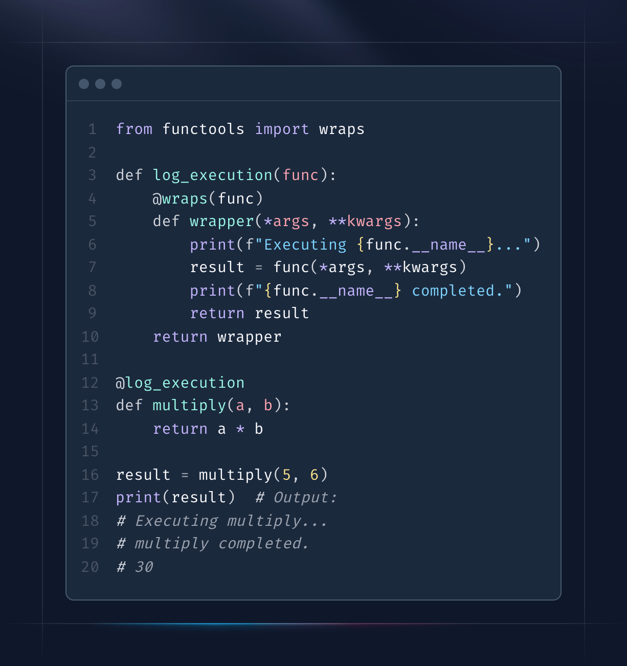 Adding Logging or Monitoring: The Decorator pattern can be used to add logging, performance monitoring, or other cross-cutting concerns to your functions or classes without modifying their core implementation.