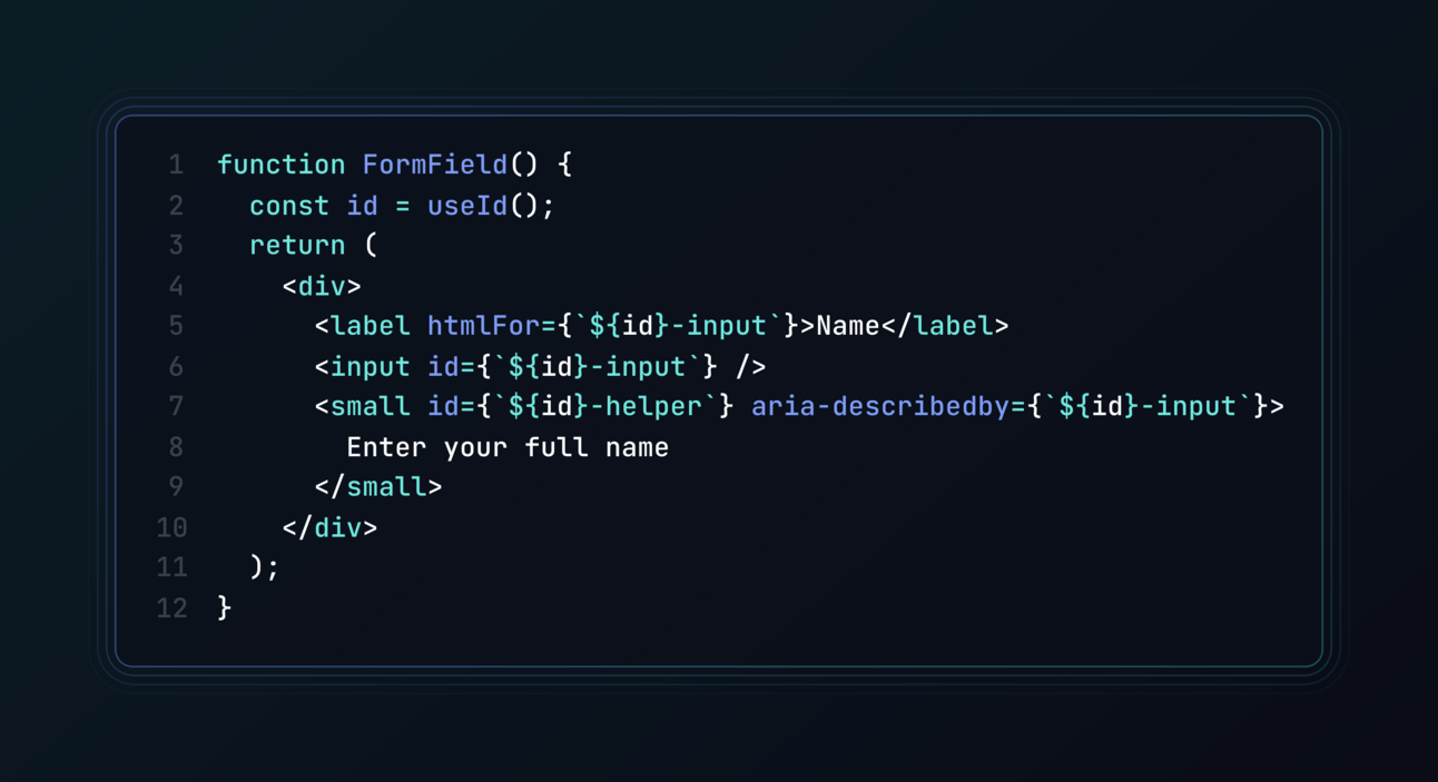 Accessibility Requirements: When you need to associate form labels with inputs or create ARIA relationships between elements, especially in reusable components.