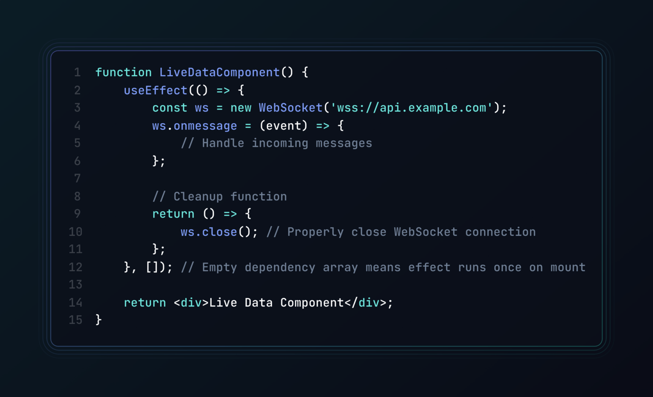 In React's useEffect hook, you can leverage the cleanup function to handle side effects that need proper teardown, such as WebSocket connections, event listeners, or subscriptions. The cleanup function runs before the component unmounts and before re-running the effect if dependencies change.