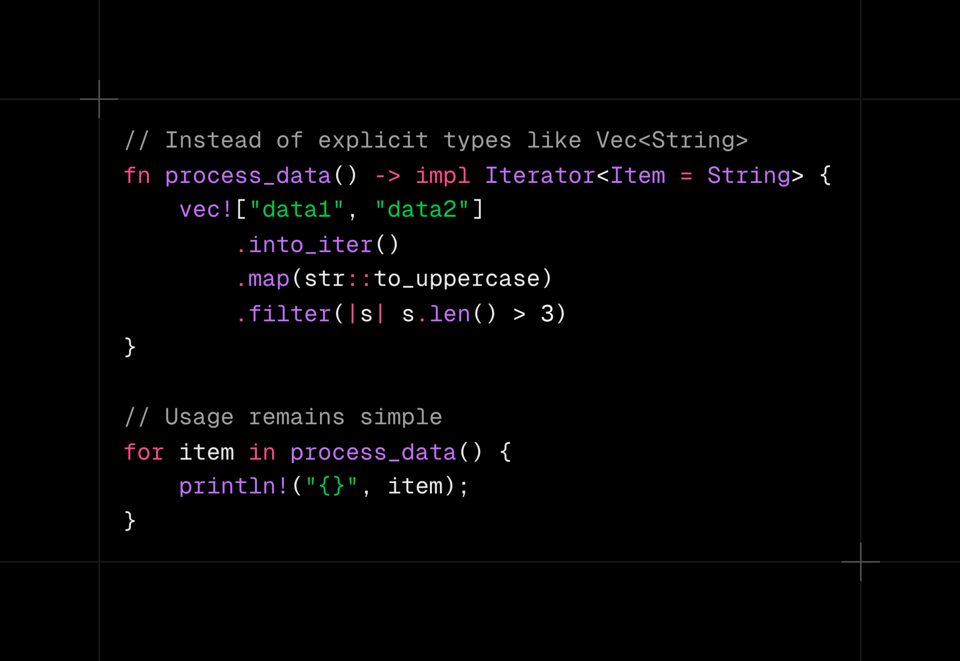 Use Rust's zero-cost abstractions with impl Trait to maintain performance while hiding complex types. This pattern allows you to return complex iterator chains or closures without explicitly typing them, while still generating optimal code at compile time.