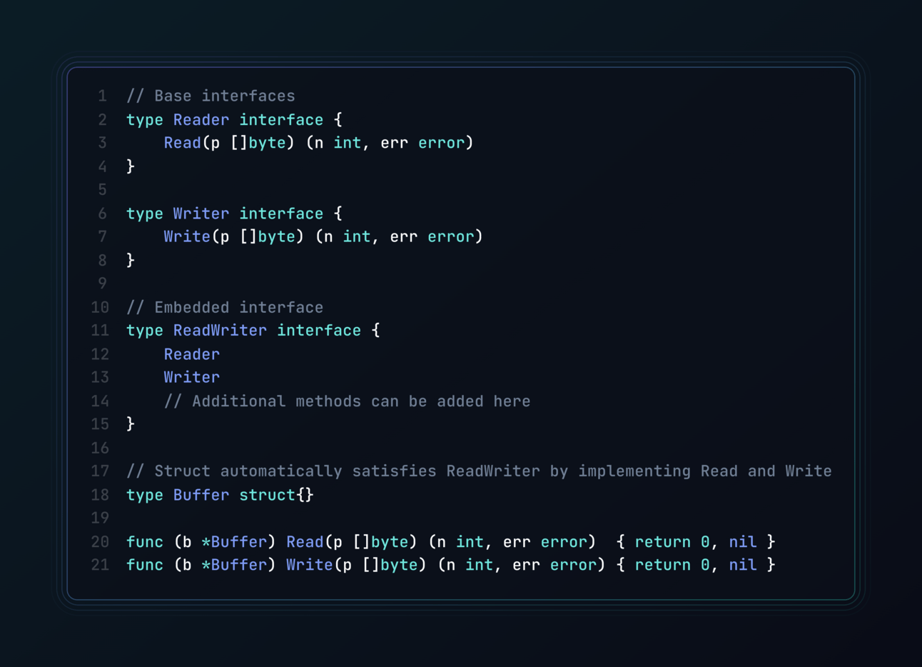 Use Go's embedded interfaces for flexible composition without explicit interface implementation. Go's interface embedding allows you to create larger interfaces from smaller ones, enabling modular API design and reducing boilerplate through implicit interface satisfaction.