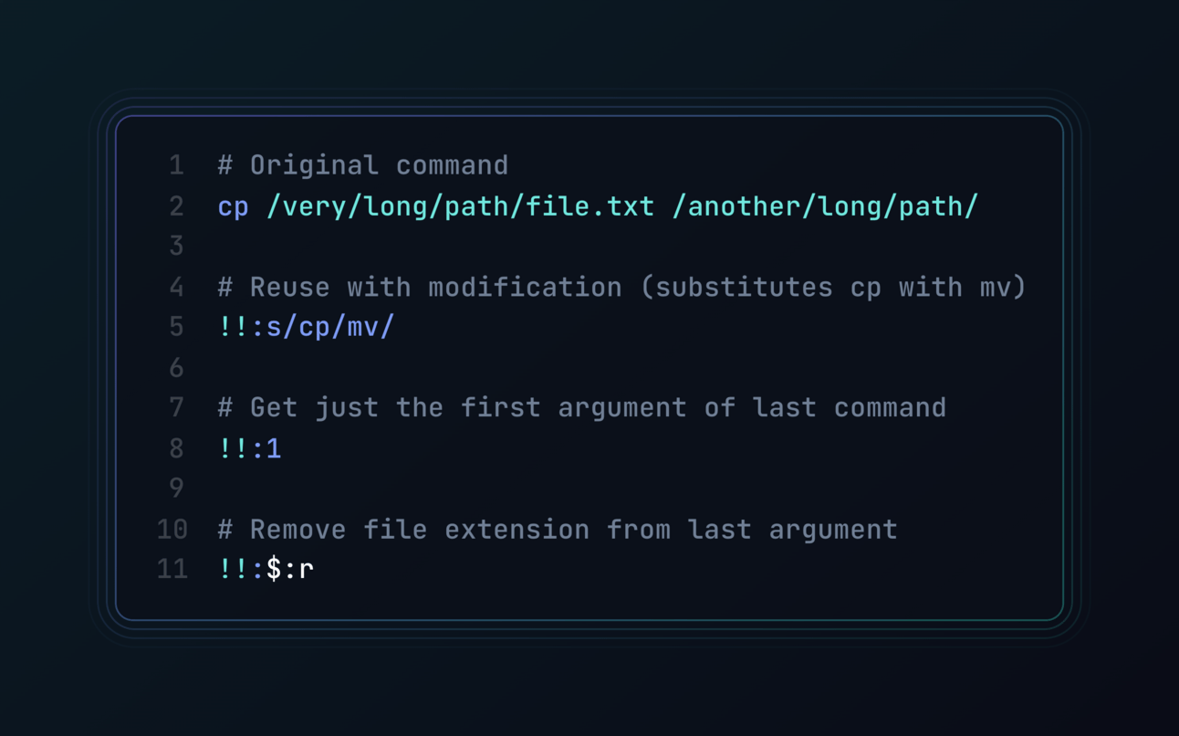 Use double exclamation marks !!) in bash to refer to the last command, combined with specific modifiers for quick command modifications without retyping. This powerful history expansion syntax allows you to efficiently reuse and modify previous commands using various modifiers like :s/old/new/ for substitution or :h for head path components.