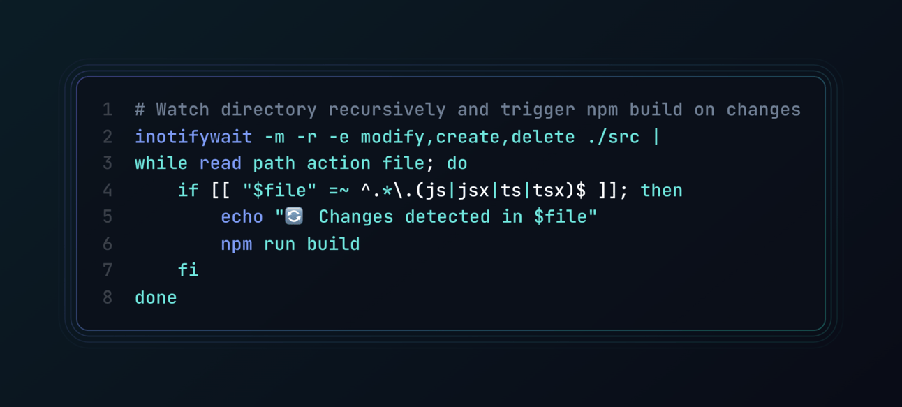 Use Linux's inotifywait command for real-time file system monitoring and automated development workflows. The command provides granular control over file system events and can trigger custom actions through shell scripting.