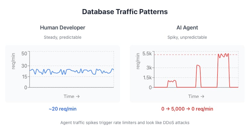 The deeper problem: agents are parallel. A human works on one thing at a time. An agent might spawn 50 parallel experiments, each hitting your database simultaneously, each one legitimate, all of them together looking exactly like an attack.