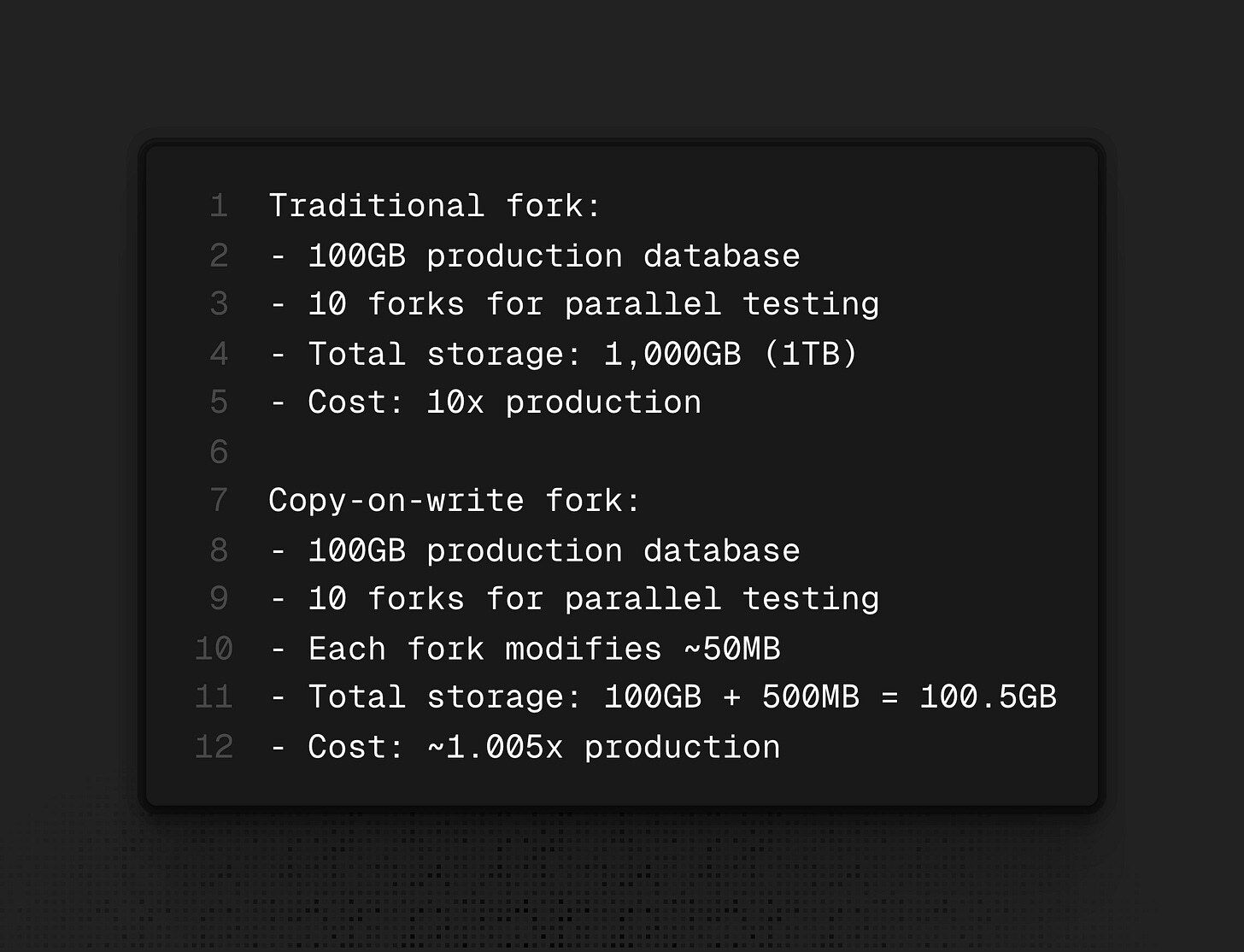 If forking a database means duplicating storage, agents will destroy your budget. Ten forks of a 100GB database equals 1TB of storage charges. Even if each fork only modifies 50MB of data.