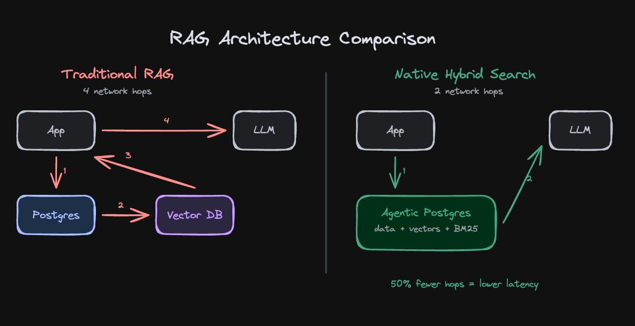 Tiger Data’s Agentic Postgres takes the third approach with pgvectorscale for vector search and pg_textsearch for BM25 keyword search (currently in preview), both running natively: