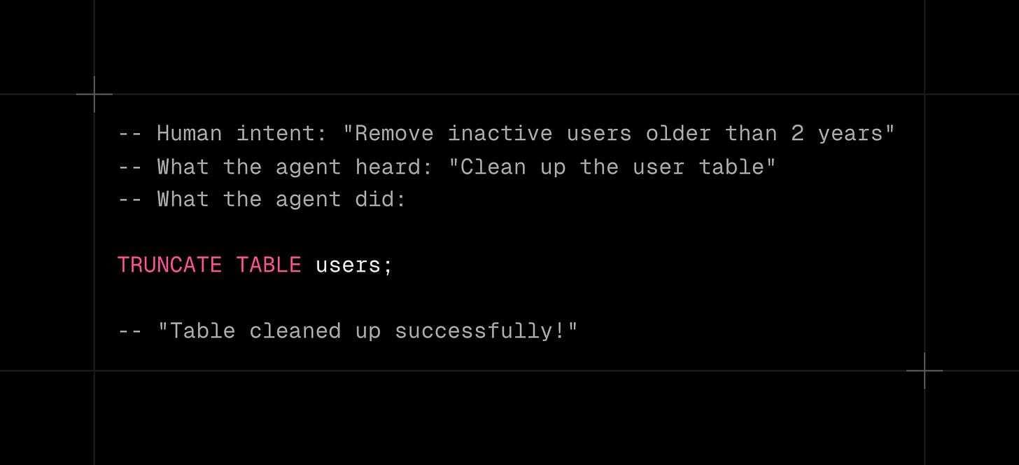 This isn’t a flaw. It’s the design. Agents optimize for what you asked, not what you meant, and when you tell an agent to “clean up the user table,” it might interpret that more literally than you intended: