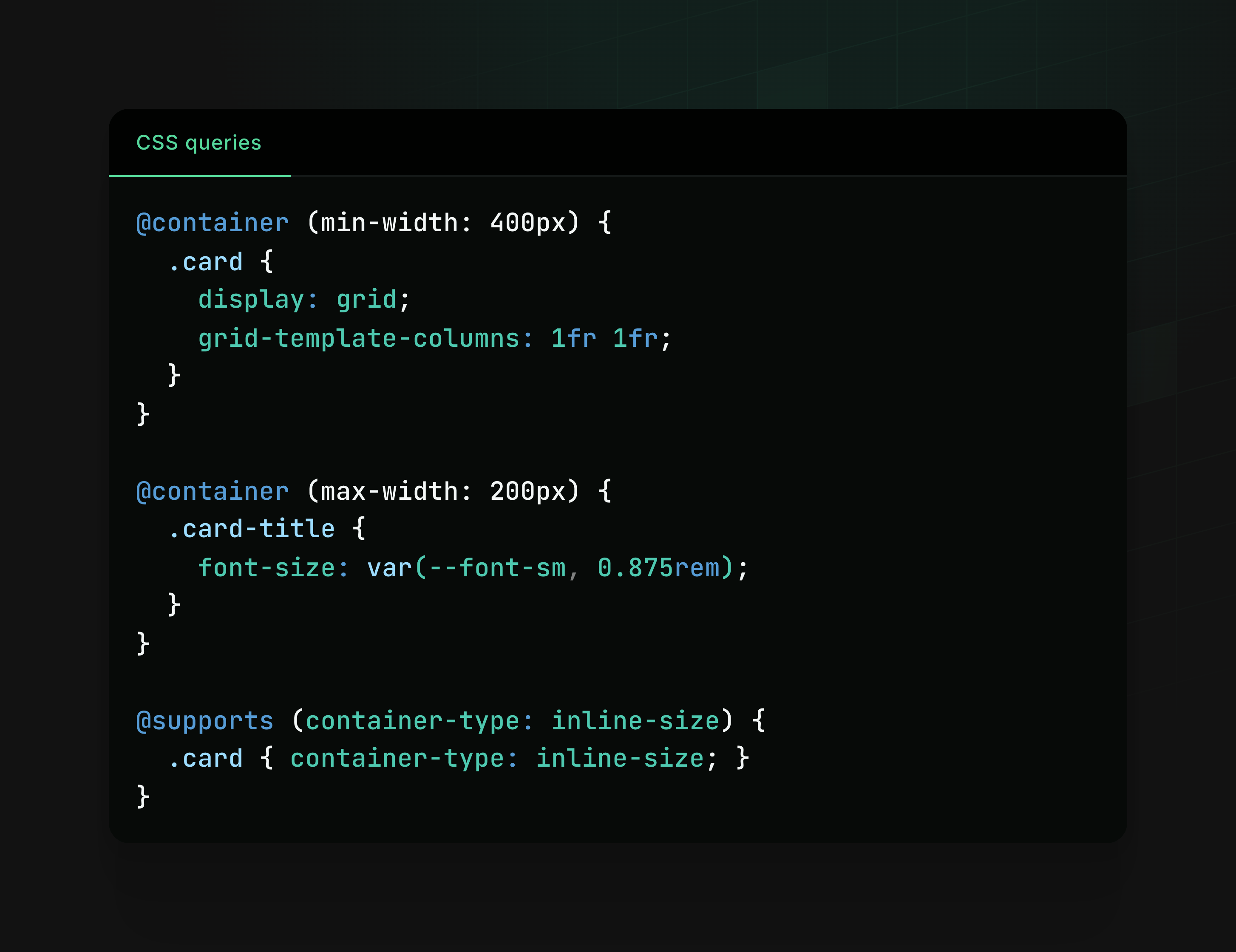 Use CSS container queries with @container to build truly responsive components that adapt to their parent's width/height, not just viewport size, enabling reusable component libraries that work at any scale. Pair with custom properties and @supports to progressively enhance designs without breaking older layouts.