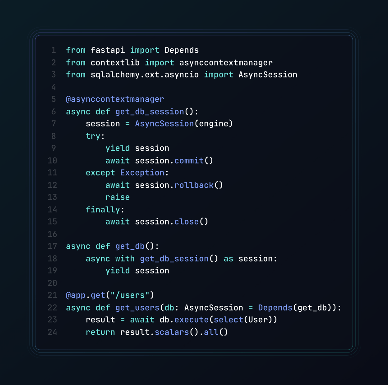 's FastAPI, you can use dependency injection with async generator dependencies to manage database connections efficiently, ensuring proper connection handling and resource cleanup.